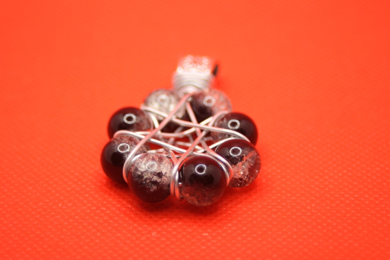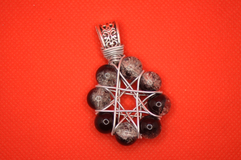Die Galsperlen sind hier mit Aluminiumdraht zu einem Stern gefertigt. Das ganze wirkt sehr jugendlich mit dem Lederhalsband.