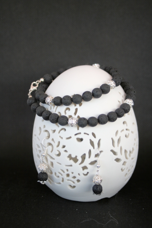 Funkelnde Halskette aus schwarzen Lavaperlen und Strassperlen.