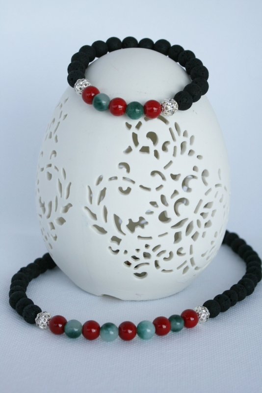 Die Kette ist aus angesagten Lavaperlen, Glasperlen für modernes und Strassperlen für das elegante Desing gefertigt.