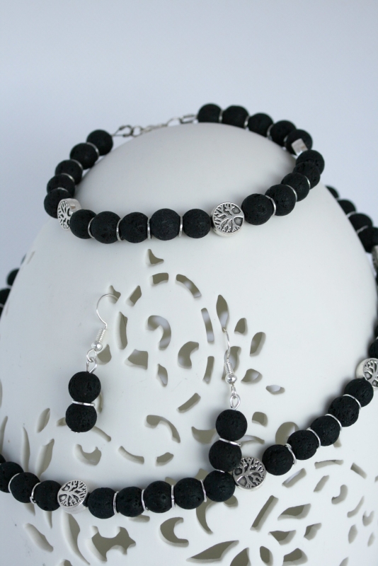 Eine Perlenkette aus 8 mm Lavaperlen. Dazwischen Binderinge und als highlight Lebensbäume.